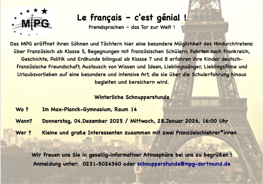 Jetzt schon Lust eine neue Fremdsprache zu lernen? Dann schnuppert rein ins Französische! Wir bieten euch, liebe Viertklässler_innen, am Donnerstag, 4. Dezember 2025 und Mittwoch, 28. Januar 2026 um 16:00 Uhr bei uns am MPG ein spielerisches Kennenlernen der französischen Welt an.