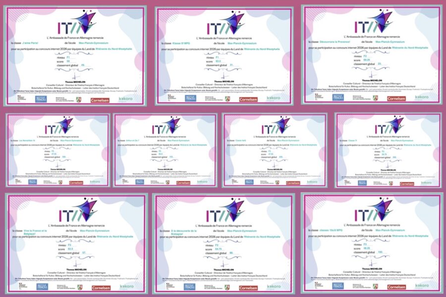 Zwischen dem 19. und 23. Januar 2026 feierten wir am Max-Planck-Gymnasium die deutsch-französische Freundschaft mit dem Teamwettbewerb Französisch des Institut français. Mit über 100.000 Anmeldungen bundesweit tauchten unsere 11 Französisch-Lerngruppen – queerbeet von der 5. Klasse bis zur EF – spielerisch in die Frankophonie und Europa ein.