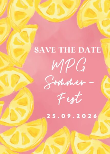 Das Wichtigste zum Schluss: Bitte merken Sie sich den Termin für unser Sommerfest bereits jetzt vor. Das MPG-Sommerfest findet am Freitag, den 25.09.2026, von 16:00 bis 22:00 Uhr statt. Wir freuen uns schon sehr auf einen gemeinsamen, lebendigen und geselligen Nachmittag und Abend mit Ihnen und euch.